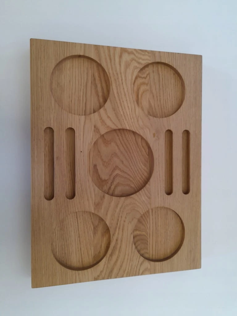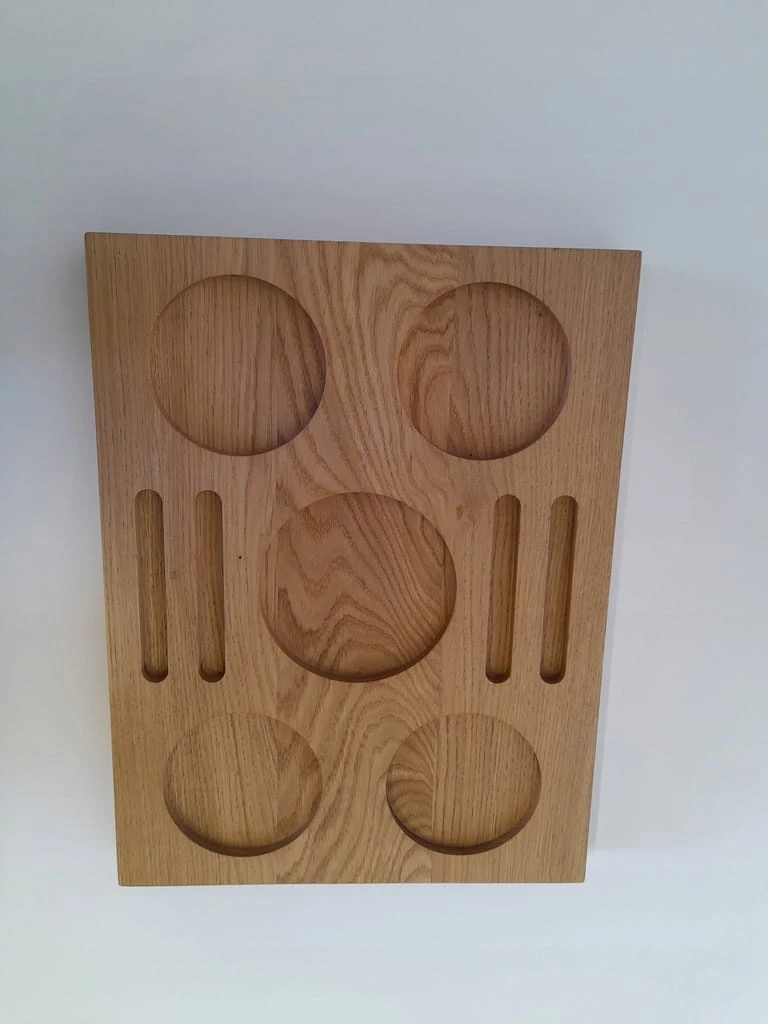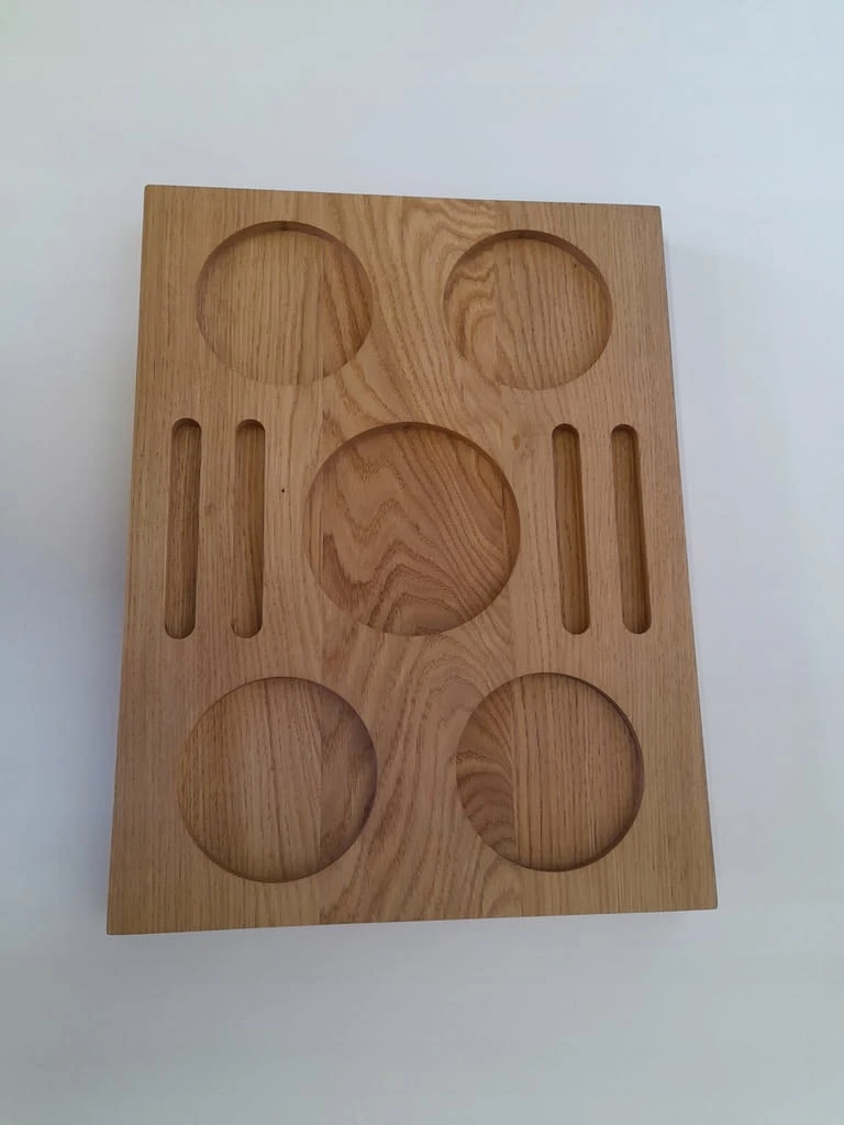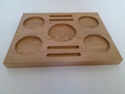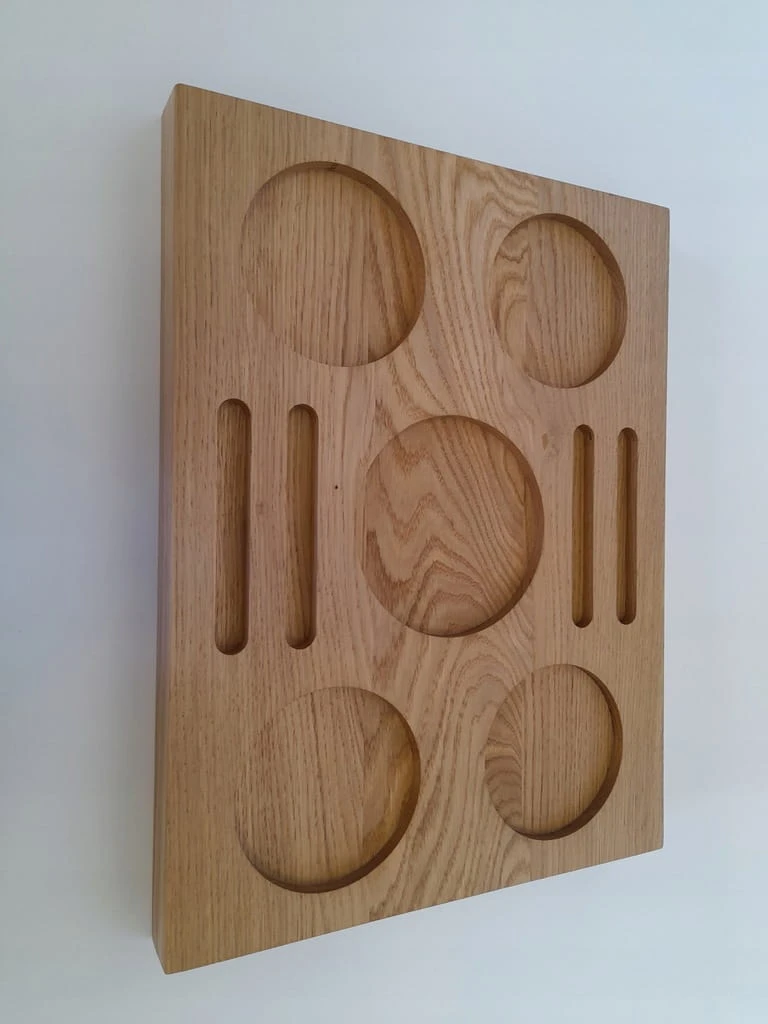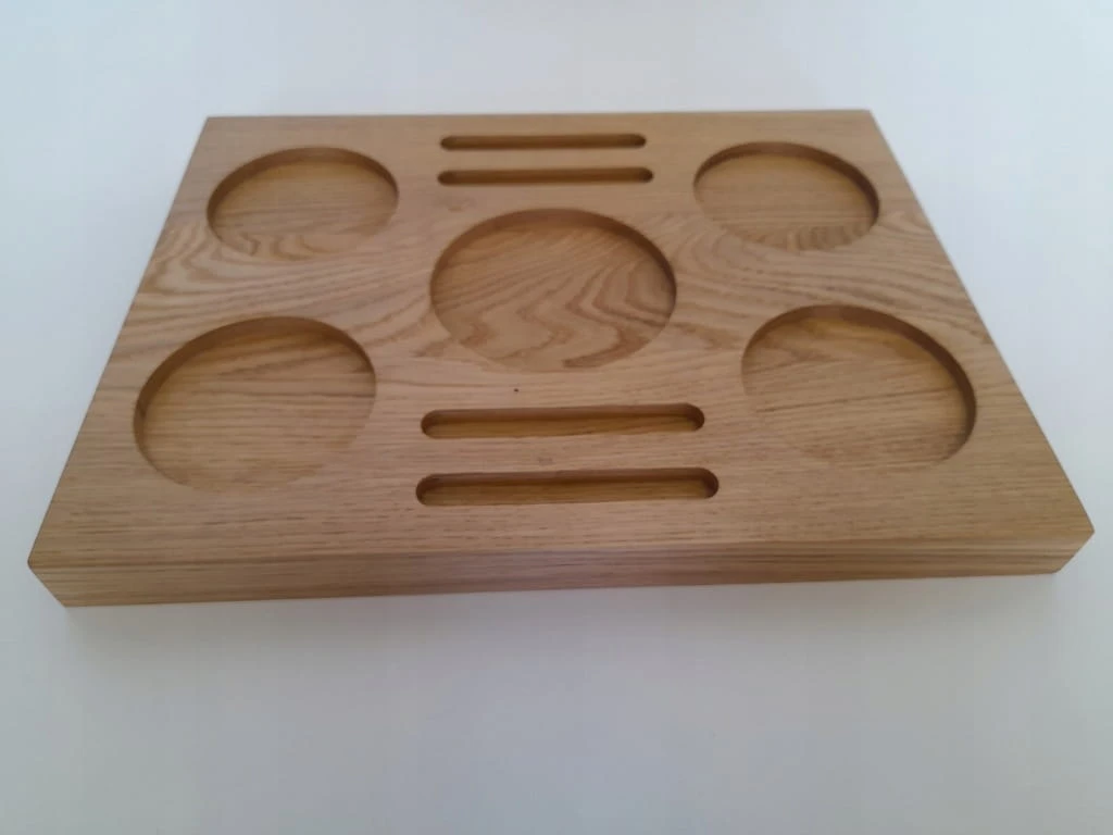 Ekskluzywna taca na napoje, whisky, wino lub inne wykonana z dębu i wykończona naturalnym olejem w jasnym odcieniu. Frezowana z precyzją – na szklanki typu tumbler, kieliszki do degustacji lub dodatki.