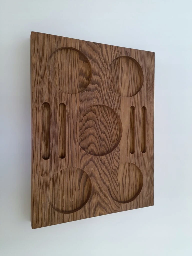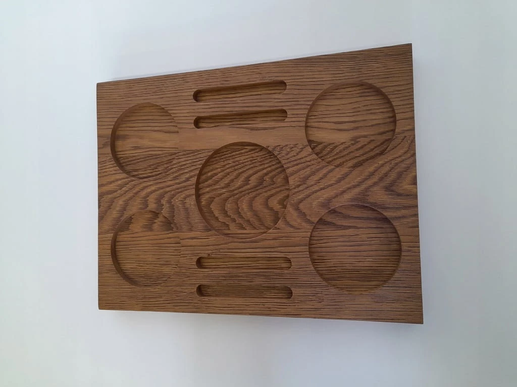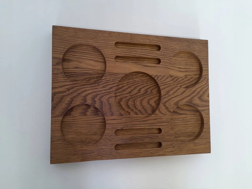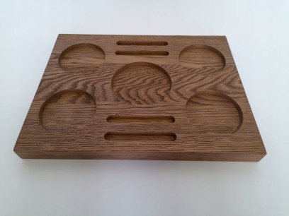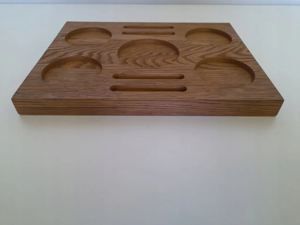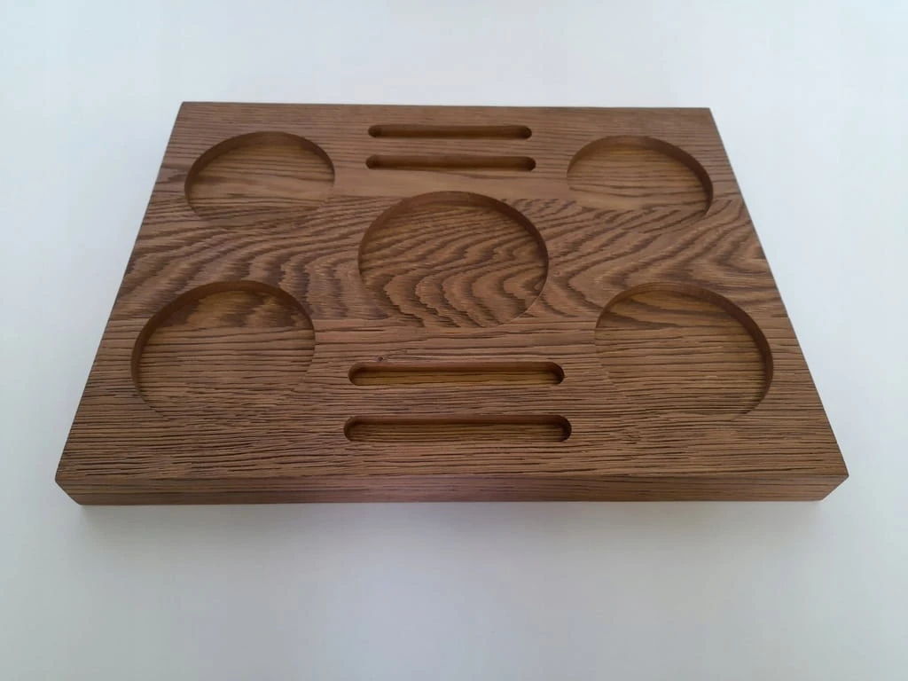 Ekskluzywna taca na napoje, whisky, wino lub inne wykonana z litego dębu i wykończona naturalnym olejem w odcieniu głębokiego brązu. Frezowana z precyzją – na szklanki typu tumbler, kieliszki do degustacji lub dodatki.