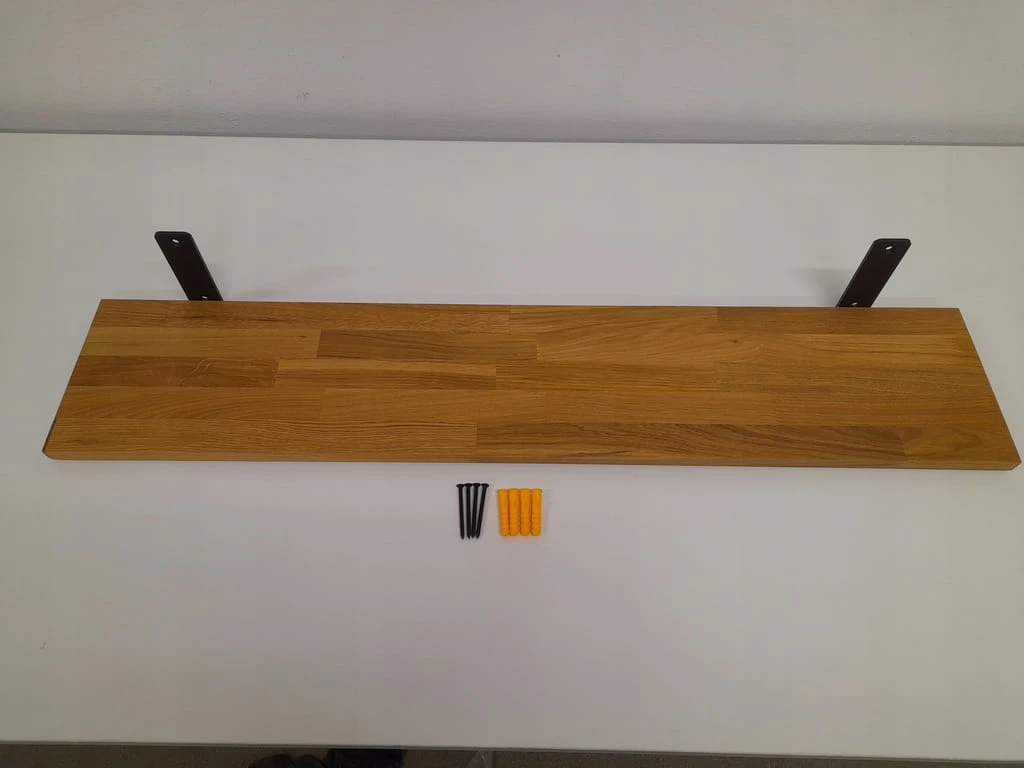 Półka dębowa 60×20×1,8 cm – naturalna elegancja i solidność. W zestawie są uchwyty, które można zamontować w górę lub w dół.