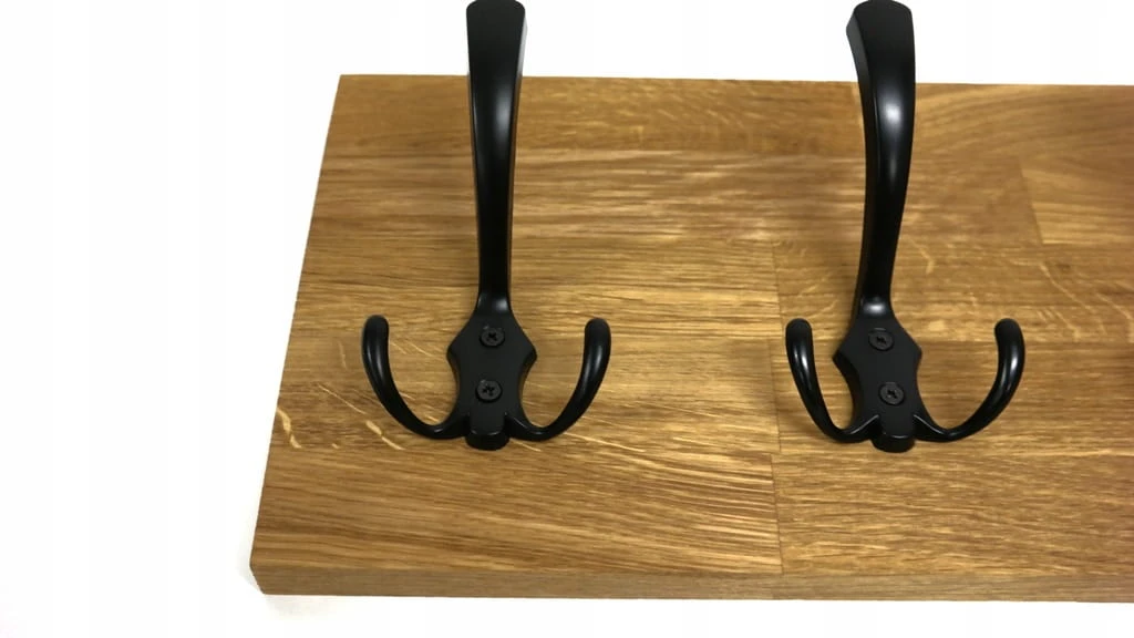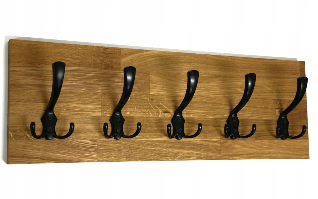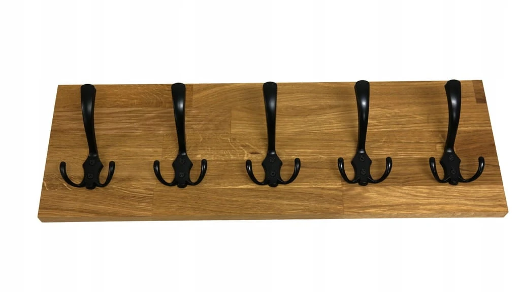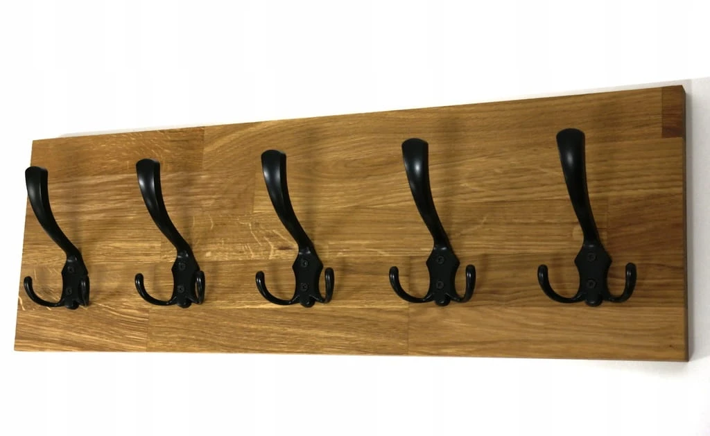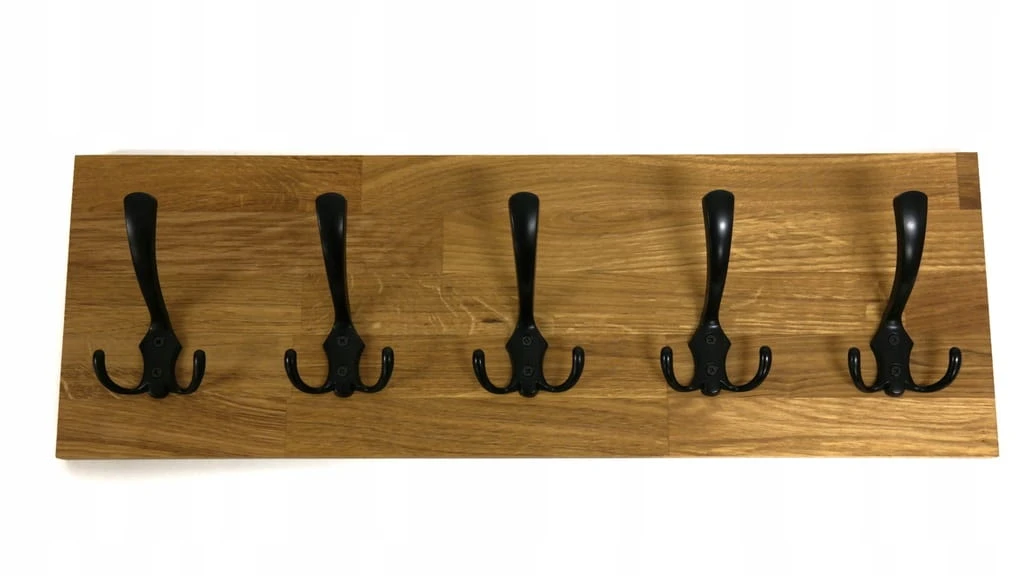 Solidny i estetyczny wieszak ścienny wykonany z naturalnego drewna dębowego, który doskonale sprawdzi się w przedpokoju, garderobie lub korytarzu. Prosta forma, ciepły kolor drewna i czarne metalowe haczyki tworzą ponadczasowe połączenie, pasujące zarówno do wnętrz nowoczesnych, loftowych, jak i klasycznych.