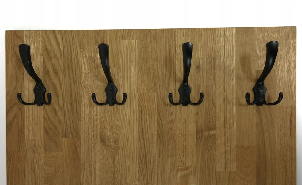 Solidny i estetyczny wieszak ścienny wykonany z naturalnego drewna dębowego, który doskonale sprawdzi się w przedpokoju, garderobie lub korytarzu. Prosta forma, ciepły kolor drewna i czarne metalowe haczyki tworzą ponadczasowe połączenie, pasujące zarówno do wnętrz nowoczesnych, loftowych, jak i klasycznych.