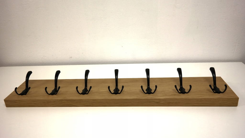 Stylowy i solidny wieszak ścienny wykonany z grubej płyty fornirowanej naturalnym fornirem dębowym. To produkt klasy premium, który łączy funkcjonalność z estetyką – idealny do przedpokoju, holu, garderoby lub biura.